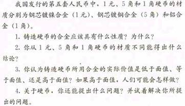 9、(1)铸造硬币的合金应该具有一定的硬度,能耐磨损和抗腐蚀,这样硬币才可以使用一定的年限;铸造硬币的合金也不能太硬,否则,硬币上的图案和数字不易被压印出来;铸造硬币的合金也不能太昂贵,等等。(2)三种金属的价值:镍>铜>铝。(3)铸造硬币所用合金的实际价值应该低于面值。如果高于面值,人们可能会把硬币收藏起来或高价出售,而不当作货币使用。