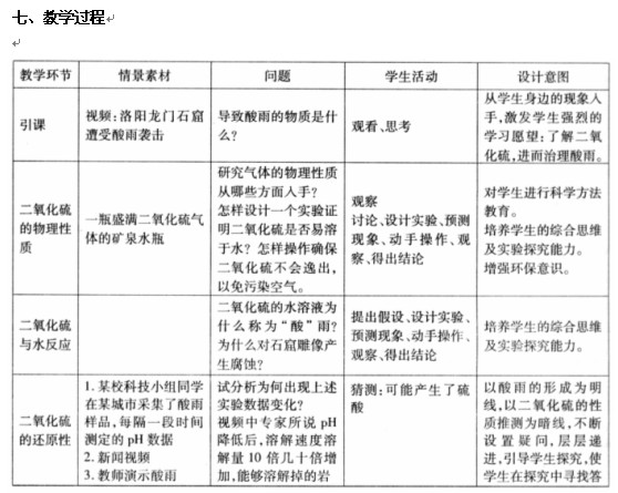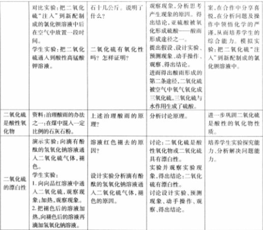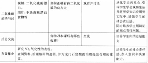 另外,二氧化硫是大气污染的两种典型代表之一。体现新课程标准“关注人类面临的与化学相关的问题,培养学生的社会责任感,参人意识和决策能力”的要求,加强环境教育,关注环境问题,体现了知识与社会、生活、健康、环境的联系,并将科学精神和人文精神融合其中,在介绍二氧化硫主要的性质与应用时,不回避对环境健康带来的负面影响,并指出化学在解决这些问题时可能的方向和作用,有助于培养学生的科学态度和价值观。