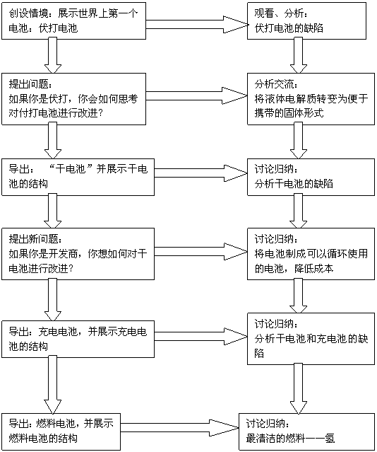 初中化学已经从燃料的角度初步学习了“化学与能源”的一些知识,《化学能与电能》的第一课时学习了:原电池的概念、原理、组成原电池的条件。由于学生之前没有电化学的基础,理解原电池原理有一定的难度。所以本课时设计:同学们通过换位思考,担任不同的角色,导出生活中同学们熟悉的各种电池的发展过程,增强学生的创新精神;然后依次的分析,各种化学电源的原理,电极材料,电子流向,电池的缺陷,既增强了学生的分析,综合,应变能力,同时又促进了对原电池原理的进一步理解。