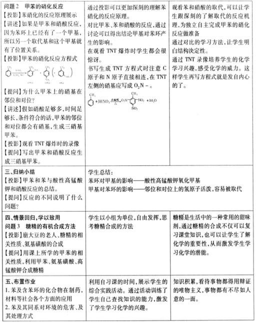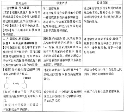 通过甲苯、苯、粗苯与酸性高锰酸钾的分组探究实验,学会比较学习物质性质的方法。通过苯、甲苯与硝酸的反应,理解原子团之间的相互影响。