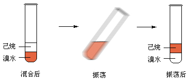 (1)溴水与己烷:两溶液混合后,首先是分层,无色己烷在上橙色溴水在下,振荡后,不反应,但要发生萃取,结果因溴单质的转移,己烷呈红棕色,而溴水则几乎为无色。如图: