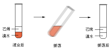 (2)溴水与己烯:两溶液混合后,首先是分层,无色己烯在上橙色溴水在下,振荡