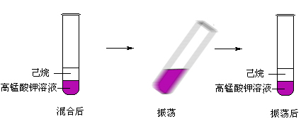 KMnO4溶液在下,振荡后,不反应,也不发生萃取,结果无色己烷仍为无色,紫红