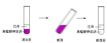 (7)KMnO4溶液与己烯:两溶液混合后,首先是分层,无色己烯在上紫红色