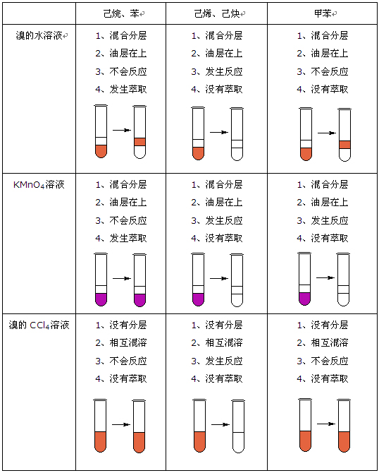[例] 溴水、KMnO4溶液分别与己烷、己烯、己炔、苯、甲苯反应的现象