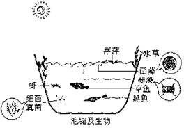 7.拟调查一个池塘生态系统(如图)的组成成分。请根据图示及提供的实验器材,写出调查项目。