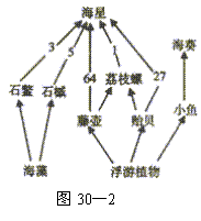 目标检测 1.在浮游植物→小鱼→海豹→虎鲸这条食物链中,若虎鲸增加1kg体重,至少消耗浮游植物的量为 A、1kg B、10kg C、125kg D、1000kg 2. 3.下列除哪项外.均为对生态系统内能量流动特征的描述: 7图30—2表示一生态系统中生物种类间的相互关系,图中 ① 此生态系统中处于第三营养级的种类有 。 ② 当除去全部海星一年后,与对照地区相比,该处生物种类组成发生了很大的变化,其中_________成为优势种,而石鳖和石械数量大为减少,其原因是_______________________。 参考答案 1.C 2.B 3.A 4.C 7.海星、荔枝螺、海葵 海星和荔枝螺 ②藤壶 藤壶大量繁殖,占据了岩石表面,使海藻不能生长,石鳖和石槭因失去食物而数量减少。