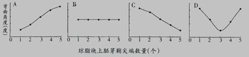 【典型考题1】(09广东A卷)在5个相同的琼脂块上分别放置1—5个水稻胚芽鞘尖端,几小时后将这些琼脂块分别紧贴于5个切去尖端的胚芽鞘切面一侧,经暗培养后,测定胚芽鞘弯曲角度(如下左图所示)。正确的结果是