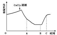 (3)赤霉素促进茎的伸长主要与细胞壁的伸展性有关。有人进行了CaCl2和赤霉素对某植物种子胚轴生长速率影响的实验,结果如右图所示。由图分析可知,一定浓度的CaCl2溶液对细胞壁的伸展起_______作用;加入赤霉素溶液的时间在图中的_______(A点、B点、C点)。根据上述实验分析赤霉素促进茎伸长的可能原因是__________。
