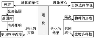 本章的主要内容就是引导学生学习以达尔文自然选择学说为核心的现代生物进化理论。该理论可以构建概念图如下: