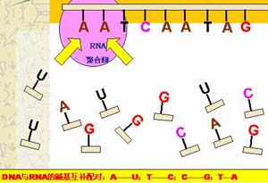 另外,教师补充:RNA的在细胞中有三种: mRNA(信使RNA),tRNA(专运RNA),rRNA(核糖体RNA)。 设问:DNA→RNA→蛋白质之间的关联?(学生阅读课文10分钟,小组发言。) 二、基因控制蛋白质合成过程  (一)转录:图示P63图4-4以DNA为模板转录RNA的图解。利用视频:显示转录过程。