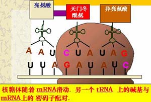 思考:mRNA的4种碱基如何决定20种氨基酸? 推理:1种碱基决定1种氨基酸?(不可能) 2个碱基决定1种氨基酸?(16种组合方式也不能决定20种氨基酸,不行。) 提出:mRNA上每3个相邻的碱基决定1个氨基酸。 小结:64种密码:61个编码控制20种氨基酸合成,另外3个(UAG、UAA、UGA)不编码任何氨基酸,而是合成蛋白质的终止信号又称终止密码。反密码子:61种tRNA。 游戏:请学生看图,想象一下核糖体这个生产车间是如何工作的?能否做一个模型显示出来? 2、翻译: 利用视频:显示翻译过程。