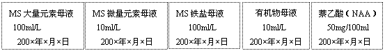 MS是穆拉希吉(Murashige)和斯库克(Skoog)两位科学家第一个字母的缩写,他们于1962年为培养烟草而设计了一种培养基,这就是组培使用中最为广泛的MS培养基;标签中间一行的数字及单位表示的意义如下,例如,100ml/L,即配制1升培养基只需从母液中提取100ml即可;50mg/100ml,表明100ml母液中含有50mg萘乙酸,如取4mg的萘乙酸,只需提取8ml母液。