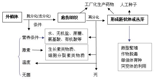 组培的原理及过程是教学中的重点,对于学生理解组培在生产实践中的重要性具有十分积极的现实意义,同时,有助于学生理解生命的本质,以及人类对生命现象进行干预的意义。组培的原理、过程及作用可用下面的图示表示。