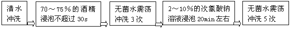 方案1:学生完成外植物体的消毒和接种工作。外植体的消毒工作至关重要,需要那些操作认真、细致的学生才能够很好地完成,因此这种方案要求学生具备一定的操作技能,并且做到耐心、细致。外植体的消毒流程如下。