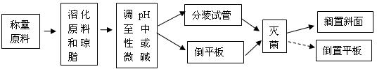 1.1 配制微生物培养基 配制培养基的基础知识是培养、观察和研究微生物的基础。教学时,可以先展示有菌落生长的培养基平板,给学生以视觉刺激,让他们体会到要观察和研究微生物,必须创设一定的条件让微生物大量快速地繁殖起来,只有形成具有一定特征的菌落,才能更好地研究微生物。进而向学生提供几种微生物培养基的配方,让学生通过比较分析各种配养基配方,明确微生物培养基的基本成分包括:碳源、氮源、无机盐和水,有些微生物还需要某些特殊的生长因子。然后,依次阐明固体、半固体和液体培养基的用途和配制方法,并结合下面的流程图概述培养基配制的操作步骤: