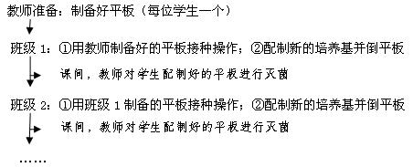 3.3 安排好教学班的实验顺序 微生物实验涉及较多的实验仪器,而且实验时需要课内和课外相结合,如实验室培养需要学生在课堂上完成两项重要的操作步骤,一是配制培养基并倒平板;二是接种操作。平板灭菌工作由于需要较长的时间,因此只能由教师在课间完成。为保证每位学生都能亲手操作,保证各个教学班能在有限时间内完成实验任务,教师可采取如下的教学流程和教学安排。