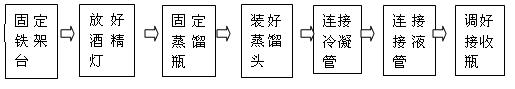 安装仪器:仪器的安装是比较复杂的操作,是实验的难点之一。下面的图示为仪器安装的基本流程。其中难度较大的是调节蒸馏瓶、冷凝管和接收瓶三者之间的高度和距离。冷凝管的安装非常重要,主要涉及两个方面,一是要注意冷凝管的进水口在下,出水口在上,并保持适当的倾斜度;二是与进水口相连接的橡皮管应与水龙头相连,依靠自来水在冷凝管中逆流达到充分冷却的效果,因此,水龙头与橡皮管一定要连接紧密。而大多数生物实验室的放水设备并未考虑到这一点,因此需要进行改造或设法弥补。