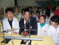 为激发实验兴趣,让同学们有更多的实验感受,可将学生分成小组,每组由4~8位学生组成(见右图),共同完成实验仪器的安装和提取精油的全部实验。提供给学生的实验材料可以是上文中提到的一些材料,如鲜玫瑰花瓣、干玫瑰花瓣、橘皮、生姜、干桂花、薄荷叶等等,让不同小组的同学选择不同的实验材料,各个小组的同学可以相互观摩和交流,最后由小组代表展示实验成果,讲述制作过程和制作心得。