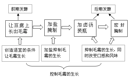 从上图中可以看出,腐乳制作的基本原理就是“控制毛霉的生长”,即先创造适宜的条件让毛霉生长,利用毛霉进行前期发酵,当发酵到一定程度时,再加盐抑制毛霉的生长。加卤汤的作用有两个方面,一是进一步控制毛霉和其他杂菌的生长,避免腐乳腐败,延长腐乳的贮藏时间;二是改变腐乳的口感和风味。