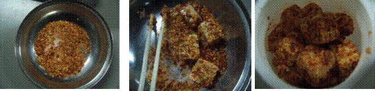 上图中的第一步,是将食盐和调料(如辣椒粉等)按一定的比例混合(如1:1),然后将经过一段时间发酵后的豆腐块放入盆中并抖动,豆腐块的周围就会沾上食盐和调料,此时,再用筷子将豆腐块一块一块地夹起放入贮藏罐中。上述操作的优点有很多,一是加盐方便,二是容易将发酵后的豆腐块分开。