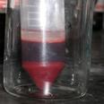 搅拌好的混合液离心后明显分为4层(如右图),由上至下依次是甲苯层、脂溶性物质的沉淀层、血红蛋白的水溶液、红细胞破碎物沉淀。取其上清液,用滤纸过滤除去脂类,再使滤液在分液漏斗中静置5min,出现分层,分离出下层的血红蛋白溶液。