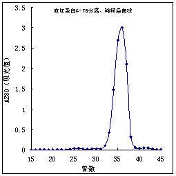 纯化:可采用柱型为Sephadex G75,柱体积为500 mL的色谱柱;加样量为10 mL(约含蛋白200 m g);用20mmol/L的磷酸盐缓冲液(pH为7.0)进行洗脱,洗脱速度可控制为0.5 mL /min,即20 min /管。此时可用A280的紫外线进行检测,如果测得的数值很高,说明蛋白含量过高,此时需要进行稀释。下图是将每管取0.5 mL稀释10倍后,用紫外线测量的结果(如下图)。