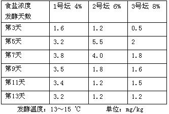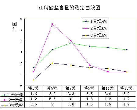 通过一段时间的发酵后,依据测定亚硝酸盐含量,我们对三坛泡菜分别在腌制过程中的第3 天、第5天、第7 天、第9 天、第11 天和第13 天分别对食盐浓度为4%、6%、8%的泡菜做了亚硝酸盐含量的检测,经过多次实验检测,我们得到以下数据: