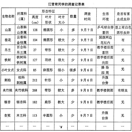 实施程序:先后采取调查(包括测量)、访问、查阅资料、鉴定、挂牌等方式了解校园的生物资源。对校园内的每一种生物都要进行登记,部分种类应采集2~3套标本,不能识别的种类应请专家鉴定,认真作好调查记录,尝试对调查到的生物进行分类,将归好类的生物资料进行整理,填写在自己设计的调查表上。