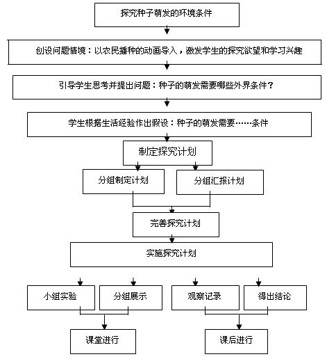 本节课的教学主要是围绕引导、组织学生开展探究活动来进行的。由于本次探究是学生们接触到的第三个探究活动,在前两次的探究中,学生们对科学探究的过程已经有了初步的认识,所以本节课学生们会再次尝试在小组内合作完成探究的过程。如何引导学生提出问题是探究活动的关键。本节课教师从学生的心理特点出发,以播放学生喜欢看的动画片入手,让学生带着愉快的心情进入到学习情境中,引导学生产生疑问,并根据已有的生活经验作出假设。在接下来的对探究实验过程的处理上,教师想到学生对科学探究的一般过程还不太熟悉,尤其对探究过程中的对照实验的设置、单一变量的控制还没有达到熟练掌握的程度;此外,如果学生在课下进行实验,教师也不能对学生进行及时的指导,无法预知和解决学生在此过程中出现的问题,因此,教师将探究实验的过程放在课堂教学中,按照“制定计划、评价计划、完善计划、实施计划的一部分”这一流程进行教学,把观察记录放在课后进行,而探究结论的汇报与交流则在下一课时进行,这样做有助于帮助学生尽快掌握科学探究的过程与方法。由于生命活动是一个动态的过程,学生是无法亲自观察到种子萌发的连续过程的,所以在本课结束前,教师设计了为学生播放种子萌发瞬间过程的录像片段这一环节,既能让学生感受到生命的悸动与神奇,同时也是对学生进行情感教育的大好时机。