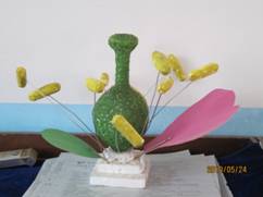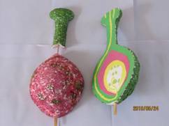 (1)材料:废旧泡沫、粉红与绿色卡纸、竹签、细线、废旧编衣针(金属),颜料(多种)