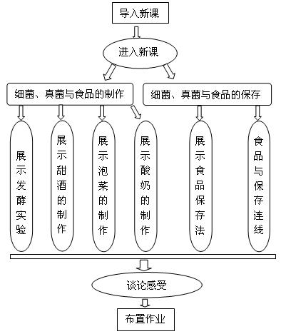 五、教学媒体选择 老师:自制的PowerPoint课件,准备的面包。 学生:自制的演示发酵实验装置、自制的甜酒、自制的泡菜、自制的酸奶以及与其相配的PowerPoint课件;食品保存方法的PowerPoint课件 | ||||
