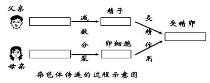 生:完成图解。试着总结人类染色体的传递过程。(在人的生殖过程中,通过减数分裂,使生殖细胞中的染色体数目减少一半。通过受精作用,精、卵融合成受精卵,受精卵中的染色体数目又恢复到23对,其中每对染色体中,有一半是来自父亲,有一半是来自母亲。这样亲代细胞核中的遗传信息就通过染色体传递给了后代。也保证了亲代与后代之间的遗传信息的稳定性。)