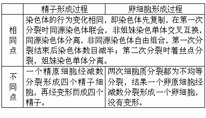 2.同时展示精子和卵细胞的形成过程图,启发学生用对比的方法找出它们的异同点,最后可列出比较表。