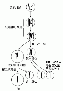 在人的卵细胞发生中,卵原细胞是在胚胎时期的卵巢中增殖的。出生后,大部分卵原细胞逐渐退化,在一生中大约有四百个左右的初级卵母细胞得到发育。人在性成熟后,一般来说每月只有一个卵泡发育成熟。成熟的卵泡显著增大,在排卵前初级卵母细胞进行减数第一次分裂,形成一个次级卵母细胞和一个极体。次级卵母细胞随即进入第二次分裂,但终止于分裂中期。以后,次级卵母细胞连同透明带及放射冠随卵泡液一起排出,进入输卵管。如果排出的次级卵母细胞遇到精子而受精,次级卵母细胞就继续完成第二次分裂,排出第二极体(所有的极体都很快退化)。如果排出的次级卵母细胞没有遇到精子不受精,则不发生上述第二次分裂,次级卵母细胞退化并被吸收。由此可知人的精子是与次级卵母细胞受精的。