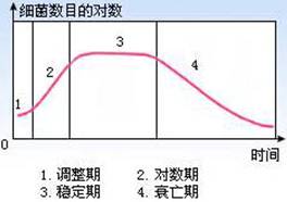 1.(2004广东生物)将少量的某种细菌接种到恒定容积的液体培养基中,并置于适宜的条件下培养,定期取样统计细菌的数目。如果以时间为横坐标,以细菌数目的对数为纵坐标作图,可以得到细菌的生长曲线。曲线中,细菌数量变化较大的时期为 A.衰亡期和调整期 B.调整期和稳定期 C.对数期和衰亡期 D.稳定期和对数期