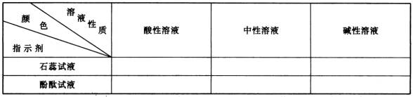 酸碱指示剂只介绍石蕊试液和酚酞试液两种,不宜再增加。教材中[实验8-7]氢氧化钠溶液使指示剂变色的实验,在讲盐酸化学性质时可以先不做,等讲完盐酸后再补做,使学生思路清楚,也突出盐酸和指示剂这两个重点。为了使学生牢记指示剂在酸碱溶液里显示的颜色,可列下表让学生填写: