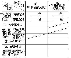 4.酸和碱教完以后,可参考上表指导学生整理有关酸、碱的知识。