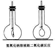 1、对于学生程度整齐,前面知识掌握牢固的班级,可以在教师引导下,通过回忆、整理,使分散的有关氢氧化钠和氢氧化钙的知识逐渐集中系统起来;也可根据已知的氢氧化钙的化学性质,推测氢氧化钠的性质。为此可按下表所列项目,由学生回忆,把学过的知识填在表里,然后把没填写的部分,结合演示实验或学生实验—一填充。例如,学生可以回忆起氢氧化钙与二氧化碳反应,而不知二氧化碳和氢氧化钠反应。可增做二氧化碳与氢氧化钠溶液反应的实验,其装置如图,在大烧瓶里收满二氧化碳,烧瓶用带导管的胶塞塞紧,伸入烧瓶的导管一端,事先绑好一个气球。当拔开胶塞倒入浓氢氧化钠溶液后,立即塞紧,振荡,可以看到气球逐渐膨大。经讨论后可写出反应的化学方程式: