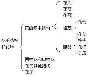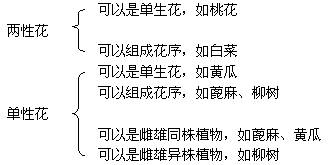 学生容易把单性花和单生花相混,看了黄瓜花以后,误以为单性花都是单生花,对此,教师要给予纠正。有关这一节所学到的几个名词之间的关系,可见下表: