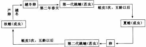关于蝗虫的发育,教师可按下表的顺序依次地出示剪贴图(或挂图)来讲述蝗虫的发育史,也可让他们观察蝗虫发育过程的实物标本。