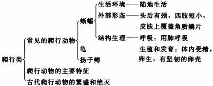 讲完新课后,教师要对爬行动物这章的知识进行小结:通过形态、结构和生殖发育的对比,可使我们了解蜥蜴比青蛙高等而复杂,更适应陆上生活。爬行动物是真正的陆生动物,而两栖动物是从水生向陆生过渡的中间型类群。