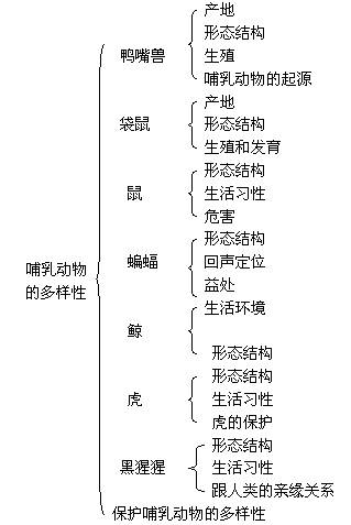 教材是通过7种主要代表动物讲解“哺乳动物的多样性”,由低等到高等,介绍了这7类主要哺乳动物的特征。其中鸭嘴兽和袋鼠是最原始和较低等的种类;鼠是营地下穴居种类;蝙蝠和鲸是适于空中飞翔和适于海洋中生活的种类;虎是地上生活的肉食性种类;黑猩猩是生活在非洲热带森林中的最高等的哺乳动物。使学生了解生活在不同环境中的哺乳动物在形态、结构、生理功能和生活习性、行为上的多样性。
