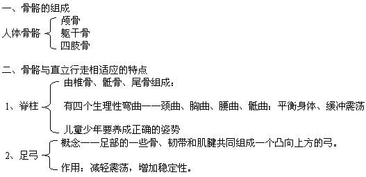 人的骨骼与直立行走相适应的特点是本节的重点,也是难点。在学生对人体骨骼有了清楚的认识后,继续让学生观察骨骼的模型,并提出观察问题:(1)脊柱的正面和侧面观察的现象有什么不同?(2)观察上肢骨与下肢骨有什么区别?(3)足有什么特点?这些对于人体直立行走有什么意义?在学生有了解脊柱有四个生理弯曲和下肢比上肢粗壮及形成足弓这些结构特点的基础上,联系生活实际,再分别讲述它们的生理意义。如联系脊柱弯曲异常会影响儿童青少年的发育、体力和体态,说明脊柱四个生理弯曲可以增加脊柱本身的弹性,缓冲剧烈运动时对脑的震荡,有利于维持身体平衡。