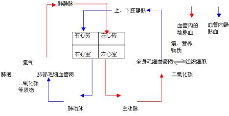 2、分析循环过程中血液成分的变化:在分析体循环过程中血液成分的变化时,采用教师引导学生联系已有的知识:毛细血管壁的特点、血红蛋白、动脉血的特点来分析,而肺循环中血液成分的变化可让学生自己分析,以锻炼学生举一反三及语言表达能力。分析完后,教师在板书结构里,把流动脉血的结构用红粉笔来表示(如体循环中的动脉和肺循环中的肺静脉),流静脉血的结构用兰色粉笔来表示 (如体循环中的静脉和肺循环中的肺动脉)。这样使学生更深刻地理解并不是动脉血管里一定流动脉血,静脉血管并不一定流静脉血。