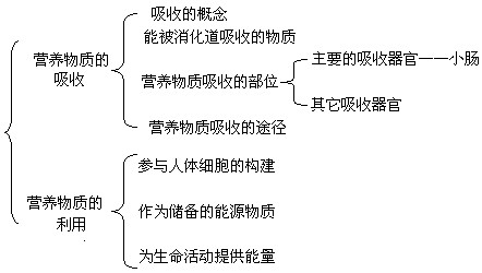 本节教学在《消化吸收》一章中占有比较重要的地位,与《第四章 血液循环》、《第六章 呼吸》及《第八章 新陈代谢》都有一定的联系。关于“吸收”建议明确三个问题:第一、什么是吸收;第二、吸收的部位,特别是吸收的主器官——肠;第三、不同营养成分的吸收途径。关于营养物质的利用建议让学生自己阅读后讨论得出营养物质的三个主要作用:一、为生命活动提供能量;二、为构建人体提供原材料;三、作为储备的能源物质。