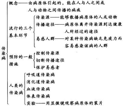 教材中关于传染病的内容包括:传染病的概念和人类的传染病;传染病流行的三个基本环节;预防传染病的一般措施。中间还安排了一个实验。