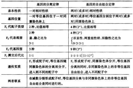 自由组合定律研究的是减数分裂过程中,分别位于不同对同源染色体的两对或两对以上的等位基因,按照分离定律分离时,不同对的等位基因在形成配子过程中独立分配到配子中去,每个配子里的非等位基因又自由组合。也就是说,一对等位基因与另一对等位基因的分配和组合是互不干扰、各自独立的。如,杂交种有两对位于不同对同源染色体上的等位基因,就能产生四种类型的配子。这是因为含有这两对等位基因的两对同源染色体,在减数分裂的第一次分裂的中期,染色体在赤道极部位的排列有两种可能性(如下图所示),这样,就会得到下列四种配子: