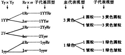 第三步:根据子代每对基因分别来自双亲,亲代每对基因不可能传给一个子代的原则,从后代中的隐性性状入手来分析:后代中有绿粒出现,一定是两个yy,应来自双亲,故A亲本中含有y。B亲本中也含有y,将A,B的空位处填入y;再分析后代中的粒形,后代中有皱粒出现,说明A、B两亲代中均含有r,将A的另一空位处填上r,最后即成为:A是YyRr、B是Yyrr。