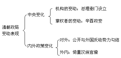 1.关于"清朝政局的变动",建议教师紧扣"变动"一词,设计一些简明扼要、突出重点、符合学生认知水平的问题:如"清朝政局何时开始变动,为何要变,怎样变,变化带来了哪些影响。"…….教师结合学生的回答,启发学生整理形成一个提纲挈领的知识网络,并根据网络结构解答变化的原因和影响。
